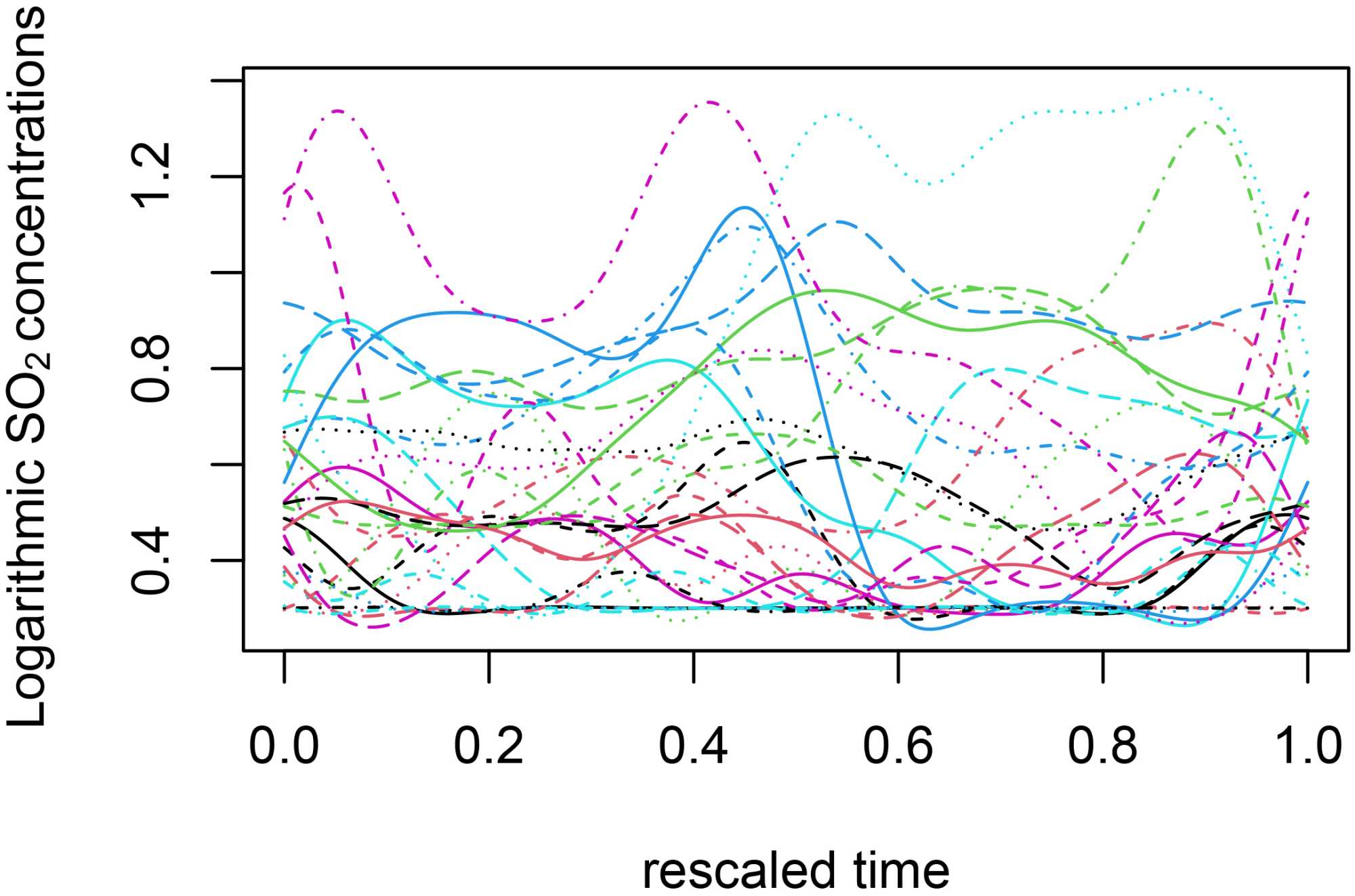 改革开放以来,随着我国工业化和城市化进程的不断加速,大气污染问题日益凸显。2013年我国遭遇了有观测以来最严重的雾霾天气。空气质量问题是关乎国家生态安全和人民福祉的重大课题。因此持续关注和研究空气质量数据有重要意义。空气质量指数(AQI)和六大空气主要污染物:细颗粒物(PM2.5)、可吸入颗粒物(PM10)、二氧化硫(SO2)、二氧化氮(NO2)、臭氧(O3)、一氧化碳(CO)不仅是天然的函数型数据,另一个重要特征是这些数据还是相依型函数型数据。以PM2.5浓度为例,可以看出本文选取的数据具有明显的函数曲线特征,因此可以用函数型数据中的平滑方法对数据进行处理。同时,这些曲线并不是具有相同分布的独立曲线,它们不是简单的随机曲线样本。一方面,某一天的PM2.5浓度曲线会受到前几天PM2.5浓度曲线的影响,曲线之间具有记忆性;另一方面,某一时刻的PM2.5浓度也总受到前面时刻PM2.5浓度的影响。因此,本文选取的样本符合假设条件,可以进行实例分析。