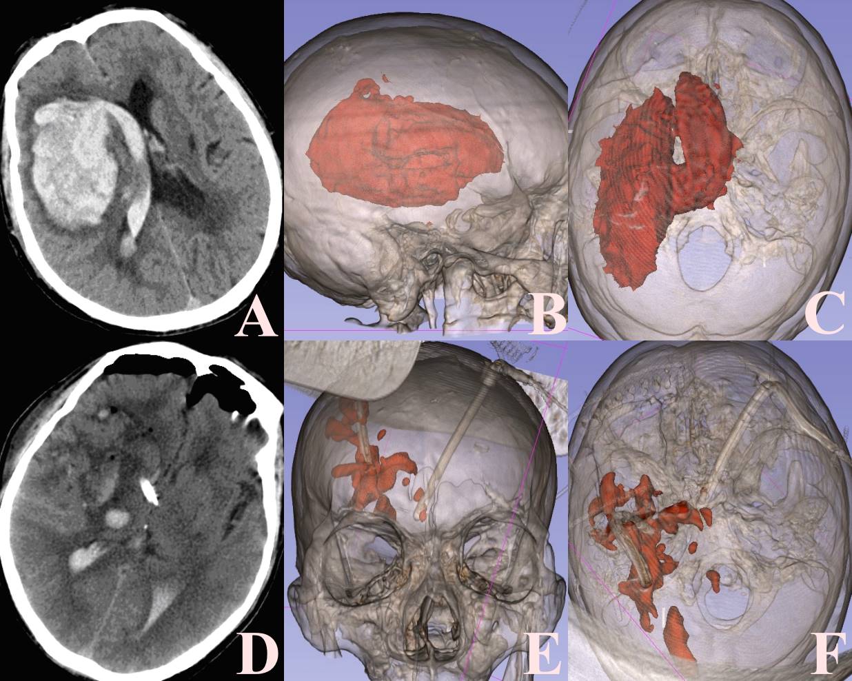 注:(A) 术前颅脑CT检查提示右侧基底节区脑出血并破入脑室,脑室铸型;((B) (C)) 术前3D Slicer软件重建的图,精确计算脑出血量,并制定安全的手术通道;(D) 术后第1日复查的颅脑CT检查,血肿已基本清除,达到减压效果;((E) (F) 术后3D Slicer软件重建的图,观察血肿清除效果,并计算残余血量。