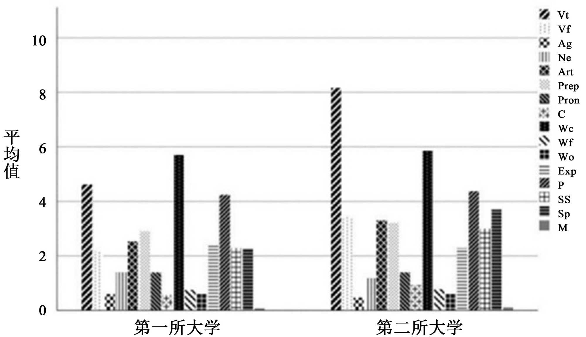 在学生写作中,最常见的三种错误类型是动词时态、词汇选择和标点符号错误。如图1所示,动词时态错误最为频繁,尤其是在第二所大学中,其学生的动词时态错误数量显著高于第一所大学学生(第二所大学每位学生8.17个错误,第一所大学每位学生4.63个错误)。由于写作任务为基于图片的故事写作,学生需要在大多数句子中使用过去时态。然而,许多学生,特别是第二所大学的学生,在使用过去时态上存在困难(图1和表5)。动词时态是有规则的,若作为教学目标,相对容易纠正。然而,需要注意的是,时态错误具有高度的体裁敏感性,例如在编写宣传材料时,过去时态动词不太会出现,从而可能导致动词时态错误减少。其次,学生的错误主要集中在过去时态,并非整个时态系统都存在混淆。