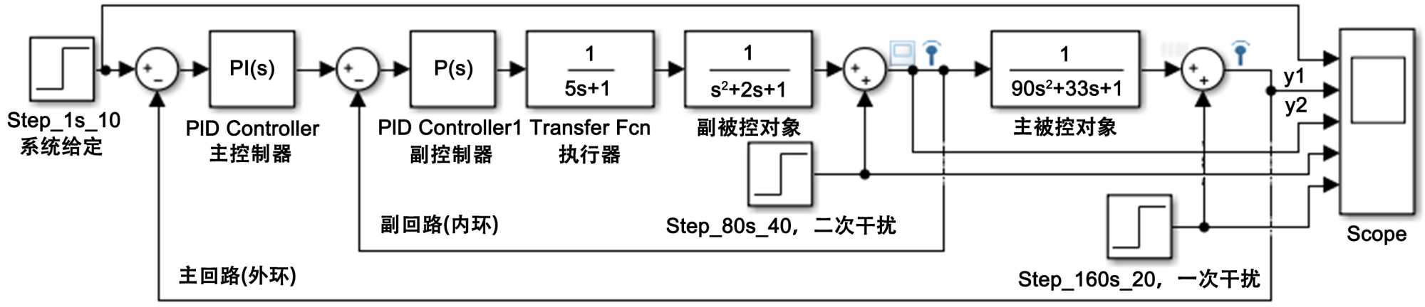 以复杂控制系统中的串级控制为例,建立该过程控制系统的Simulink仿真实验模型,如图4所示。