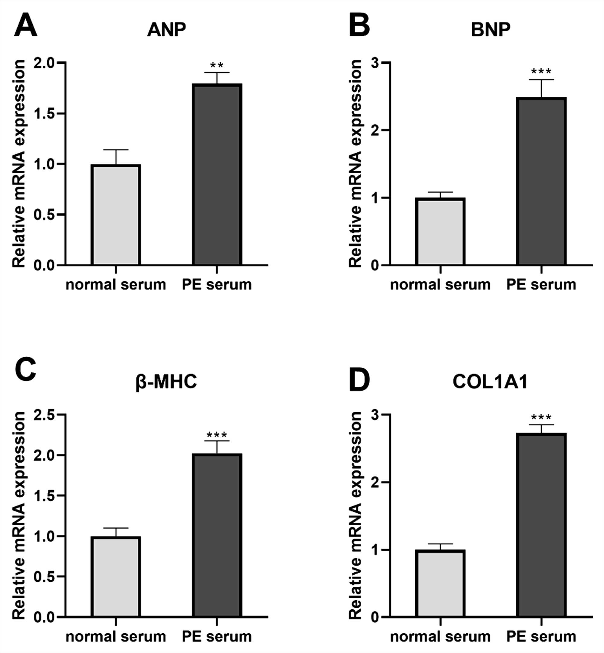 我们尝试探索PE对围产期心血管不良事件的影响机制。在使用sPE血清培养心肌细胞后发现心肌细胞中的肥大基因mRNA,例如ANP mRNA (图5(A))、BNP mRNA (图5(B))和β-MHC mRNA (图5(C))表达水平显著上升。而且,心肌细胞中纤维化基因COL1A1 mRNA的表达水平显著上升(图5(D))。