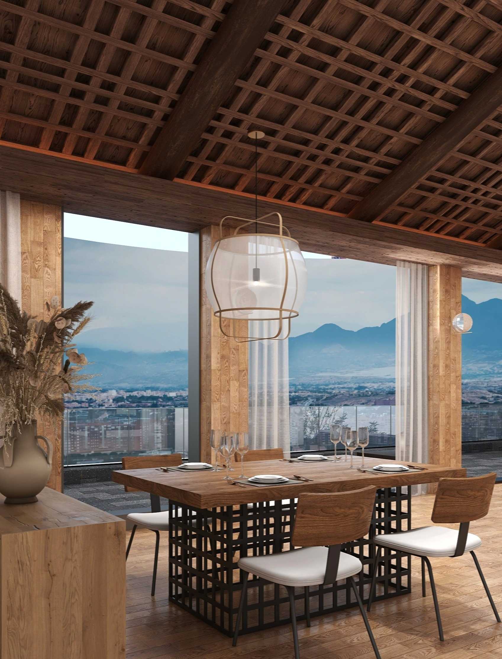 拾级而上到达二层,二层茶空间是可以欣赏全景观最佳的设置,洽谈区提供了宽敞的社交与流通的空间,室内装饰极尽质朴,木制的餐桌和石墙构成了主要的视觉感受,与窗外的云和天空相得益彰。