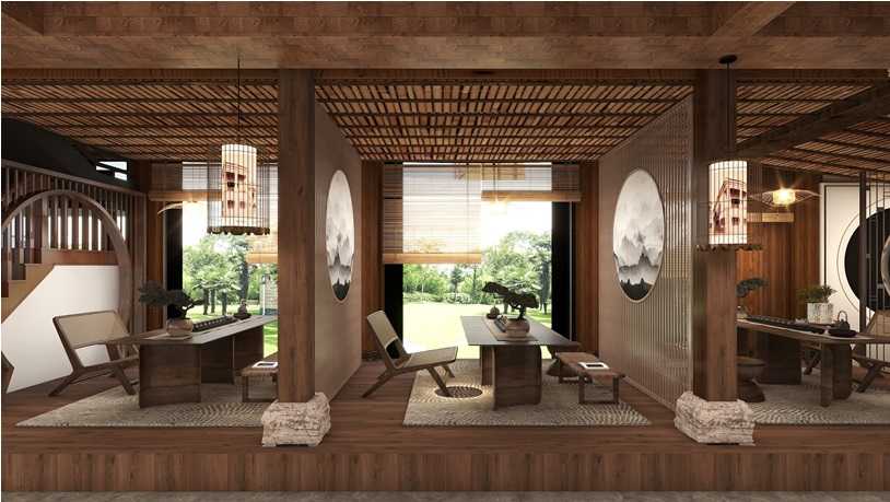 本案例以专业设计技巧为基础,尝试将设计成果应用于室内设计创作,让更多人了解中国茶文化。将中式元素融入茶楼,为人们提供凉爽、宁静、舒适的环境,提高村民福利,改善村庄基础设施建设。
