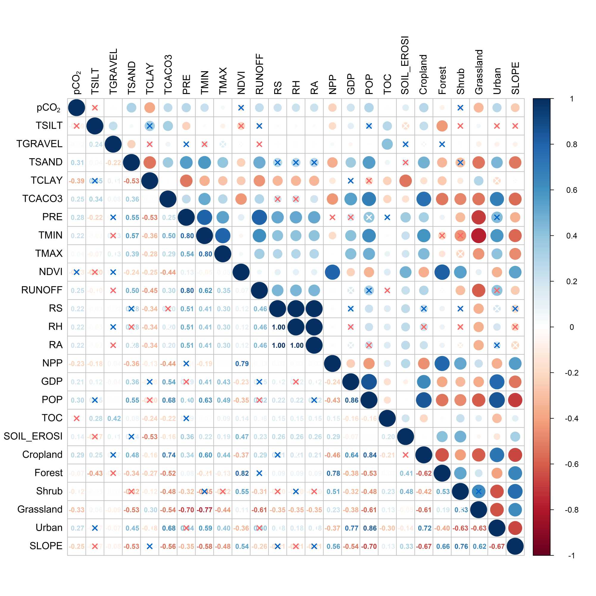 图3. pCO2与各个环境变量之间的相关性分析,“×”表示相关关系不显著