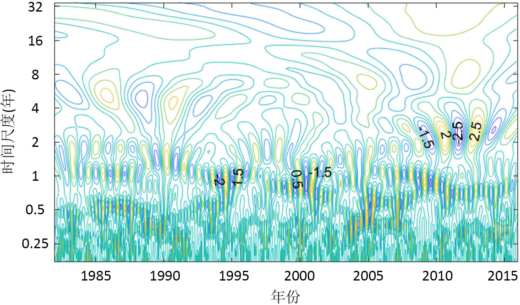 图3. 辽河流域1982~2015年降水量小波分析结果
