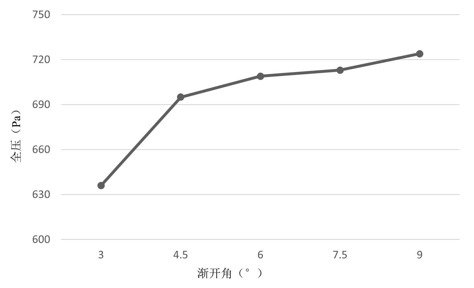 2、在布置空间允许的情况下,蜗壳型线的渐开角取值应该尽可能大,在7˚~10˚之间为宜。渐开角越大,气流在扩压段的沿程损失越少,但是局部损失越大,风扇效率表现为先增大后减小,产品设计时应尽可能选择风扇的高效工作点。
