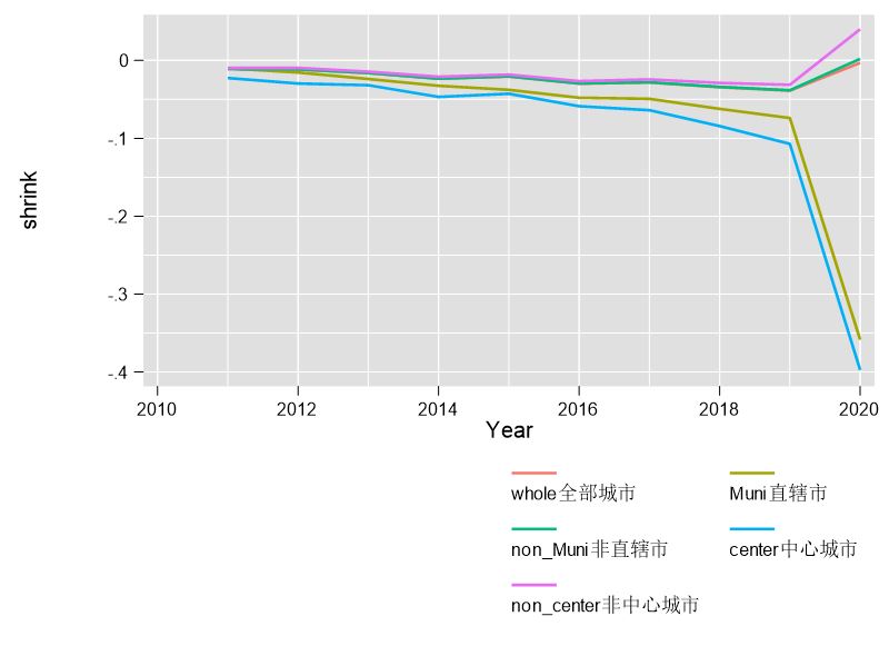 图1. 城市收缩折线图(左:全国、直辖市以及中心城市;右:八大经济区)
