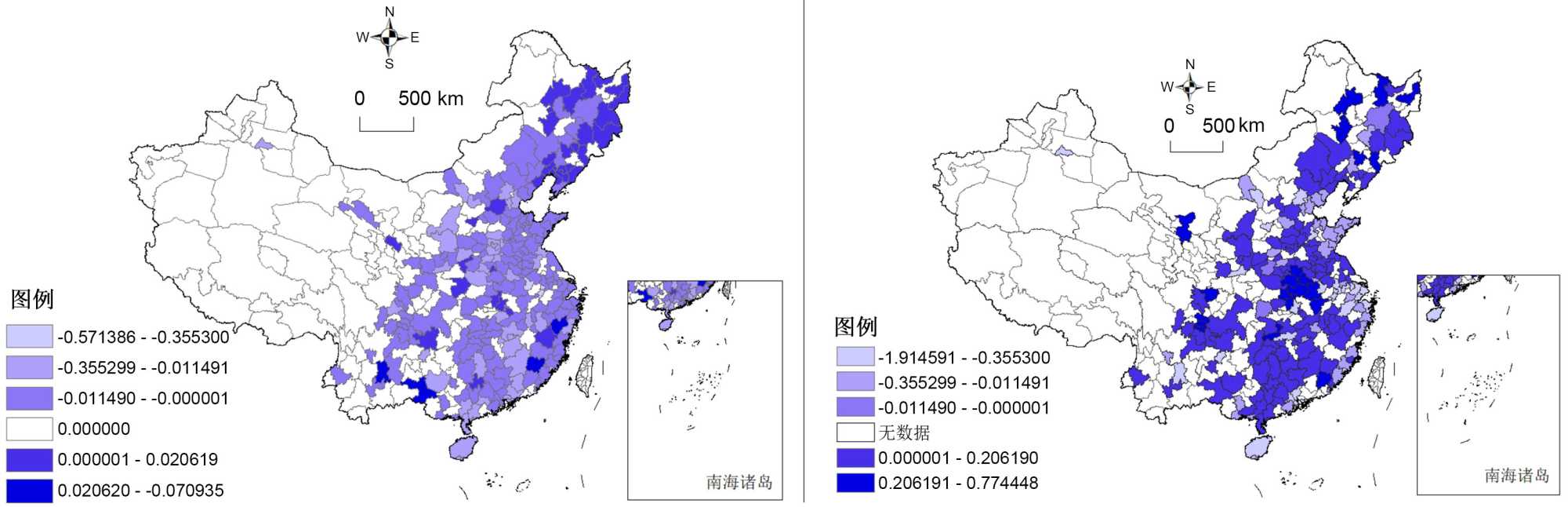 图3. 城市收缩度地形图(左:2011年,右:2020年)