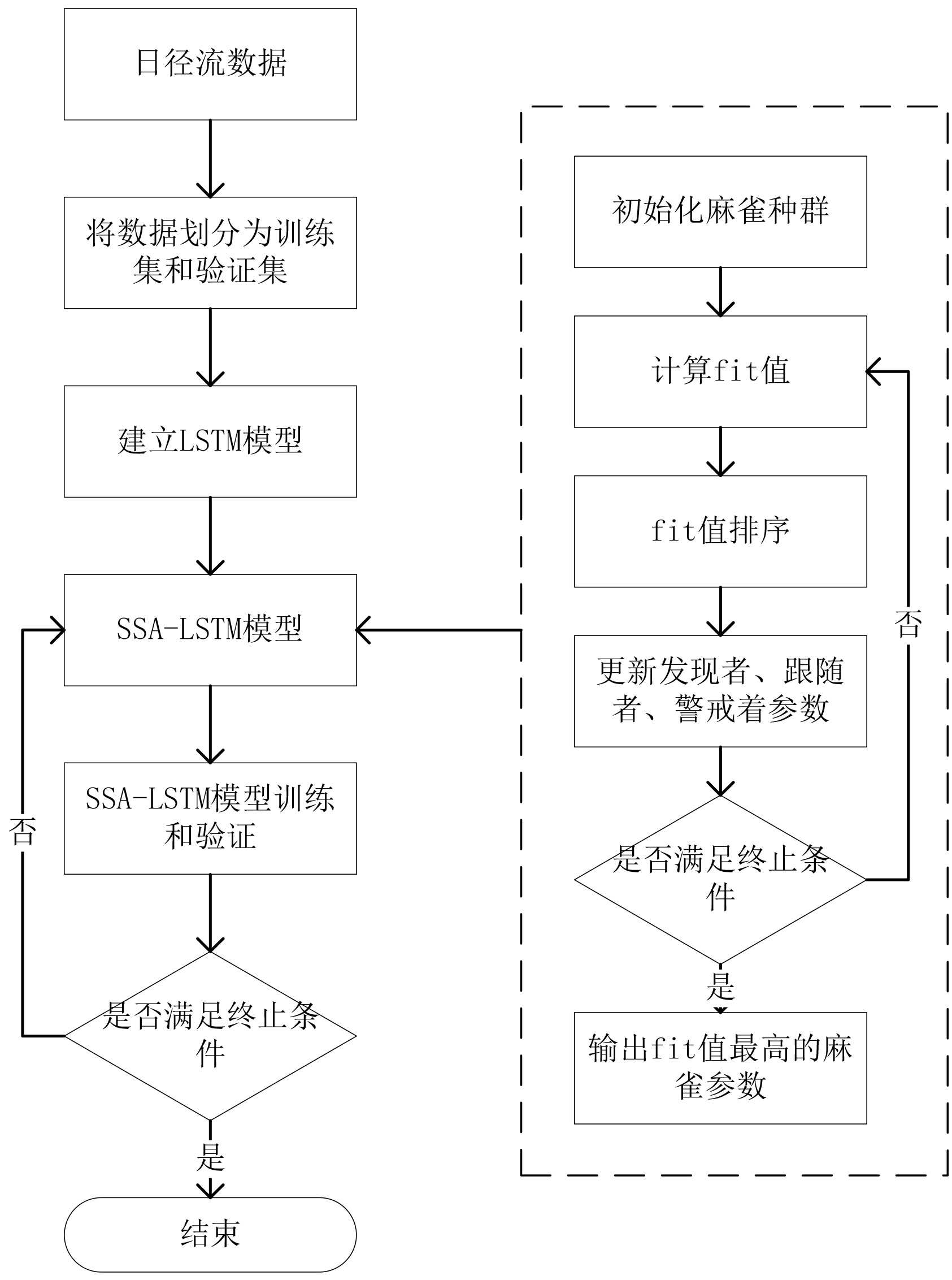 SSA-LSTM模型建立过程如图5所示,在构建针对径流数据预测的SSA-LSTM模型时,我们聚焦于优化LSTM网络中的关键超参数——隐藏层神经元数量与dropout层比率,以期通过麻雀搜索算法(SSA)提升模型的预测准确度。以下是优化与建模过程的精简与重述: