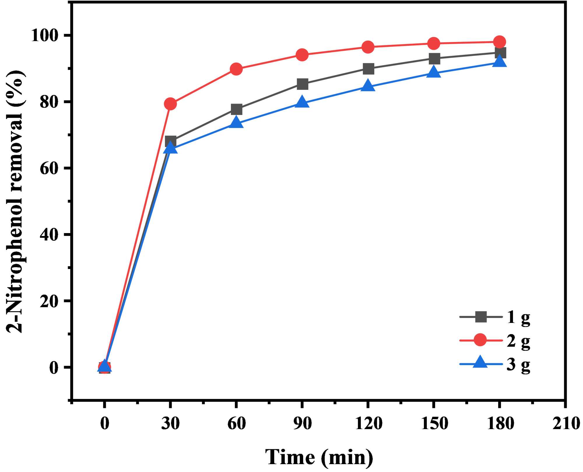具体实验条件如下:40 mg/L的2-NP,pH = 4,极板间距4 cm,电流密度20 mA∙cm−2,硫酸钠电解质浓度30 mM,催化剂为F/CuOx-GAC,反应时间180 min,催化剂投加量分别为1 g、2 g、3 g。